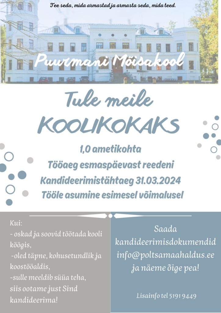 Ootame täiskohaga koolikokka meie kooli. Tööaeg esmaspäevast reedeni. Kandideerimistähtaeg 31.03.2024.