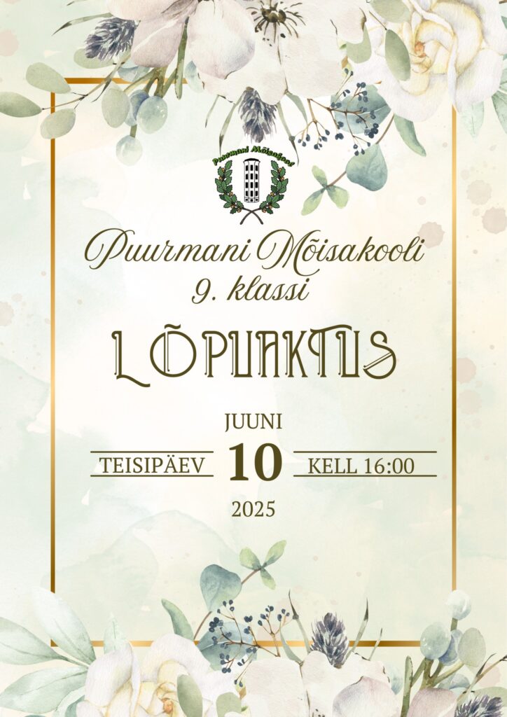 Teisipäeval, 10. juunil, kell 16.00 toimub 9. klassi lõpuaktus Puurmani Mõisakooli saalis.
