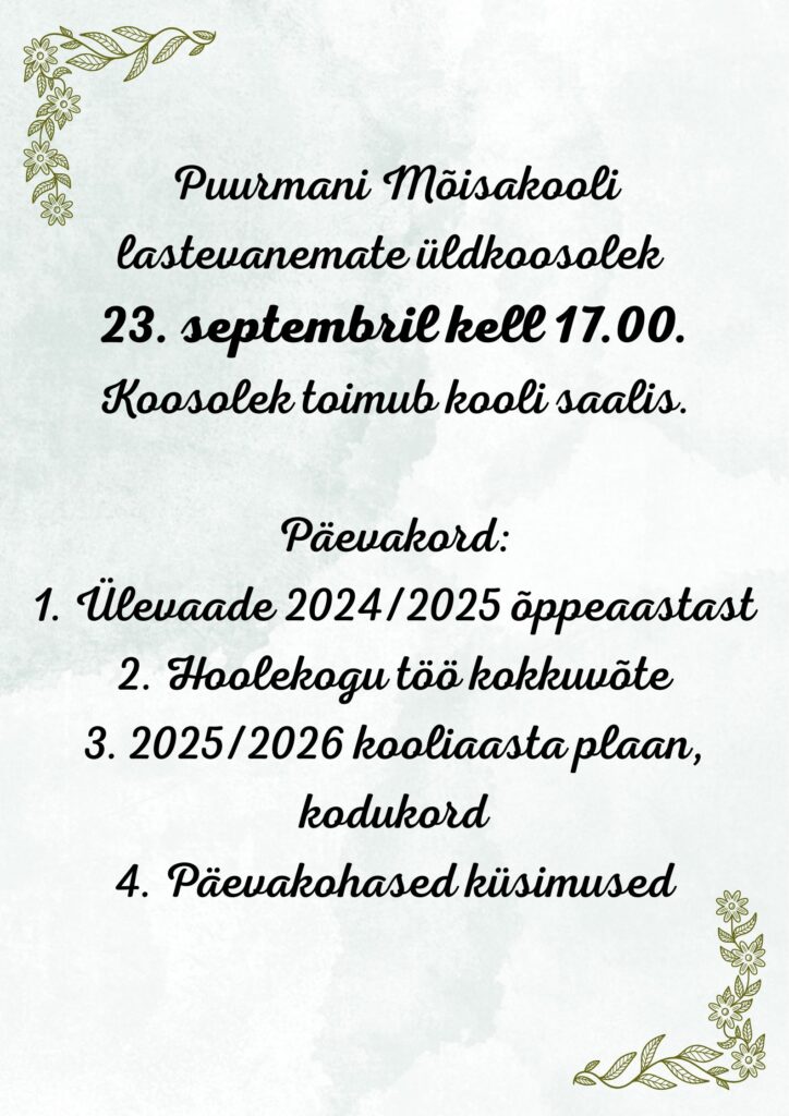 Puurmani Mõisakooli lastevanemate üldkoosolek 23. septembril kell 17.00.