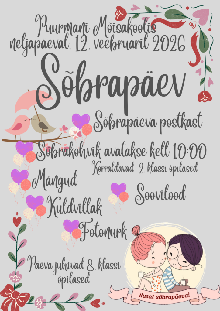12. veebruaril tähistame sõbrapäeva. Saab käia kohvikus ja võtta osa erinevatest tegevustest.
